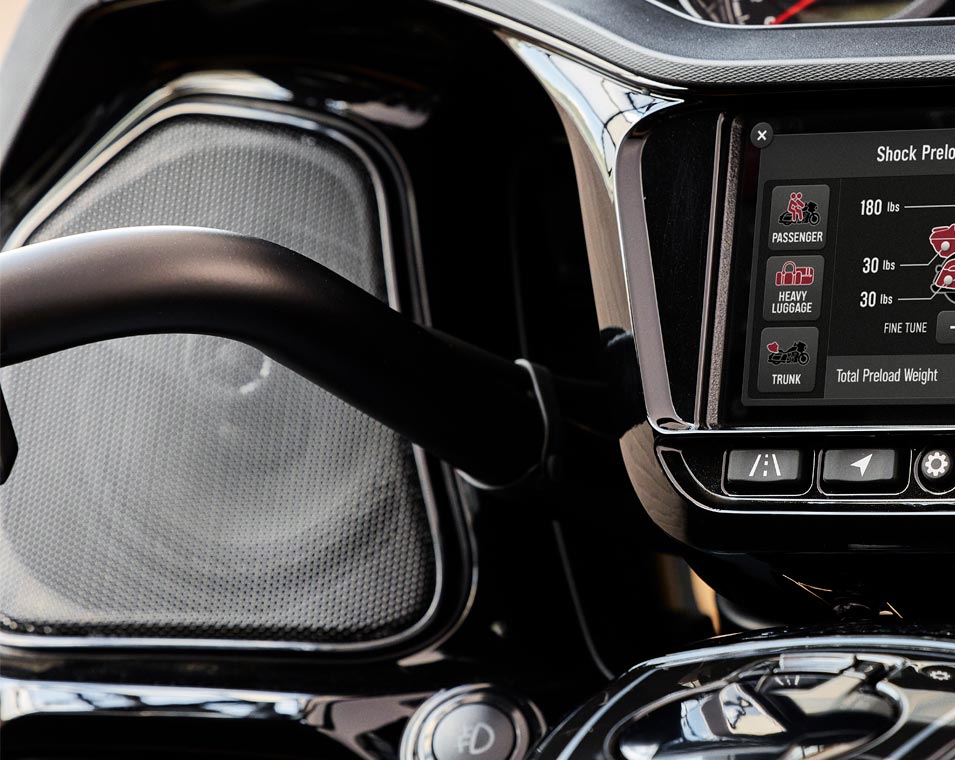 | Equipamento de Série | Tecnologia de Inclinação Smart Lean; Suspensão Traseira com pré-carga Ajustável Eletronicamente; assento aquecido; Luzes Auxiliares Integradas; Compartimentos na Parte Inferior da Carenagem; Ecrã tátil de 7 polegadas com RIDE COMMAND com integração com Apple CarPlay; Modos de Condução Selecionáveis; Sistema de Desativação do Cilindro Traseiro; Cruise Control; Indicação da Pressão dos Pneus; Tranca Remota das Malas Rígidas e Top Case; 136 Lityros de Capacidade de Carga; Guiador Highway; Plataformas Pousa-Pés do Passageiro Ajustáveis; Travões Brembo; ABS; Ignição sem Chave; Carenagem Acoplada ao Quadro; Para-Brisas Ajustável Eletronicamente; Defletores de Ar da Carenagem Ajustáveis; Punhos Aquecidos; Sistema de Áudio de 200W com Rádio FM/AM; Bluetooth; USB; Entrada Compatível com Smartphones; Tomada de Carregamento de 12V |